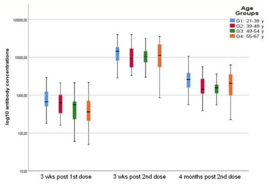 Our findings indicated that the youngest group reacted much faster to the administered first dose of the vaccine, compared to the other age groups. However, individuals 55 to 67 years old responded better to the second dose, increasing significantly their antibody levels, reaching the levels observed in the youngest group. Four months following complete vaccination, antibody levels were still present in all HCW, although significantly decreased, outreaching the antibody response after the first dose.