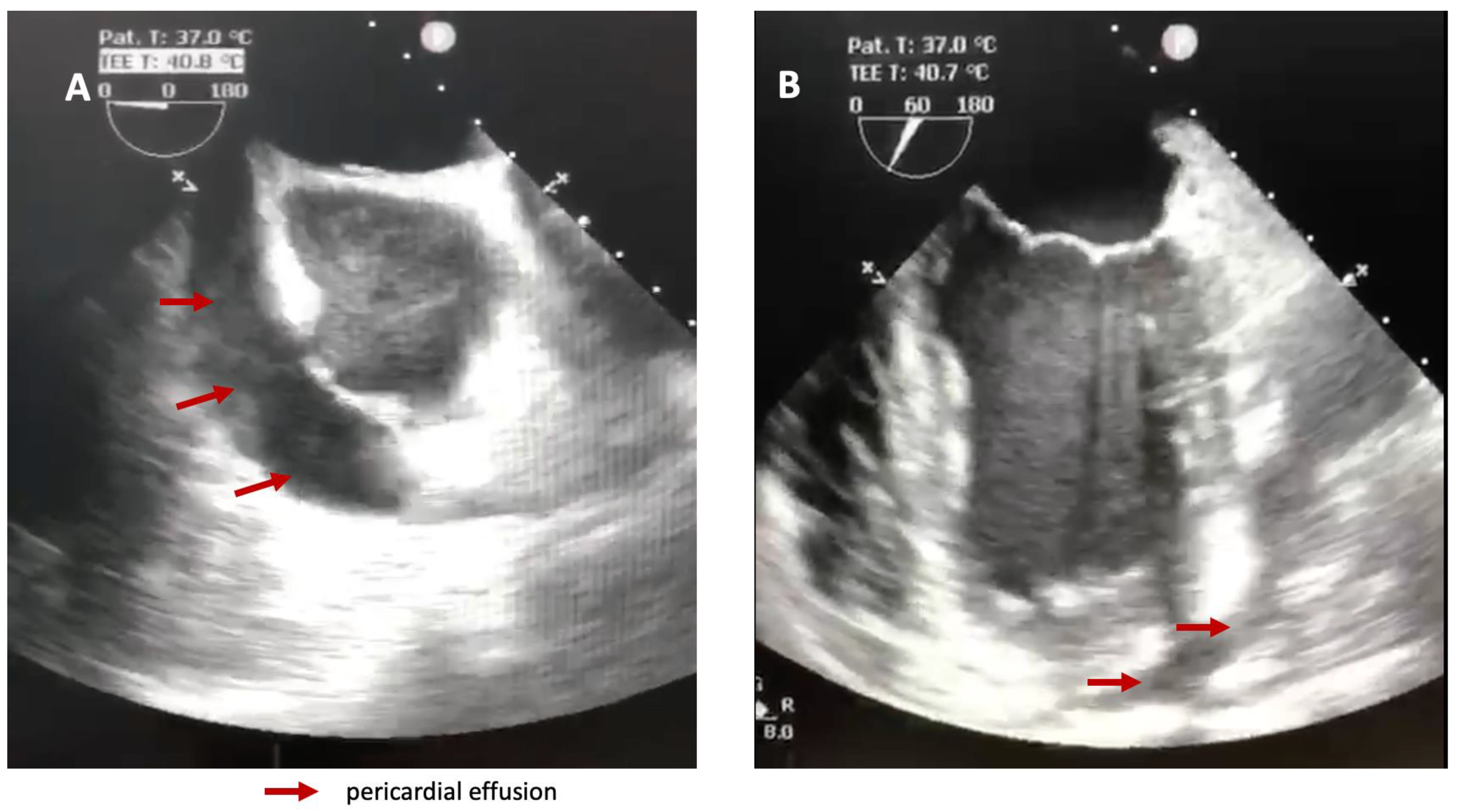 A transesophageal heart ultrasound was promptly performed and confirmed the impressive amount of liquid in the pericardium and right ventricular collapse (