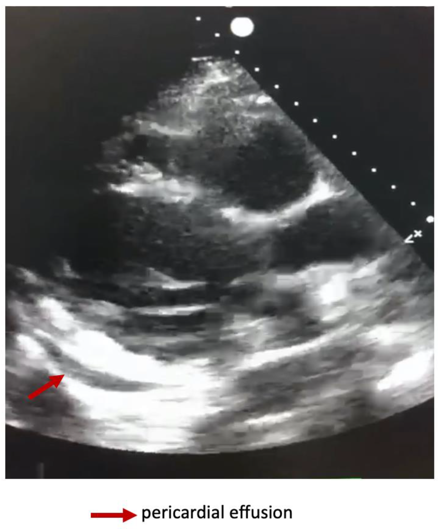 We present the case of a 42-year-old male patient who was admitted into the intensive care unit (ICU) for respiratory and renal dysfunction associated with hemodynamic instability. The patient’s recent medical history reported a positive SARS-CoV-2 mild infection one month previously that did not require hospitalization and apparently resolved with symptomatic treatment. However, four days prior to admission, the patient developed high-grade fever (up to 40 °C) and oliguria. On admission, the real-time (RT)-PCR test for SARS-CoV-2 was negative. Initial imaging examination with thoracic computed tomography (CT) revealed a 3.5-centimetre-wide pericardial effusion situated laterally from the right atrium, while the abdominal ultrasound had no remarkable features apart from mild left perirenal effusion.