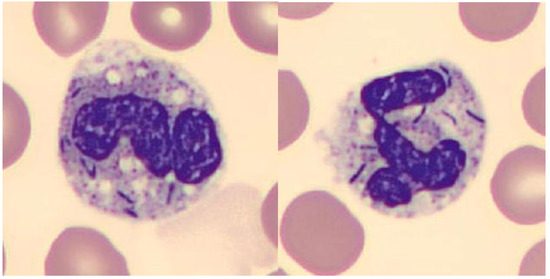 Blood smear cytology, bacillary-shaped inclusions in neutrophils (magnification x 1000, May-Grünwald Giemsa stain).