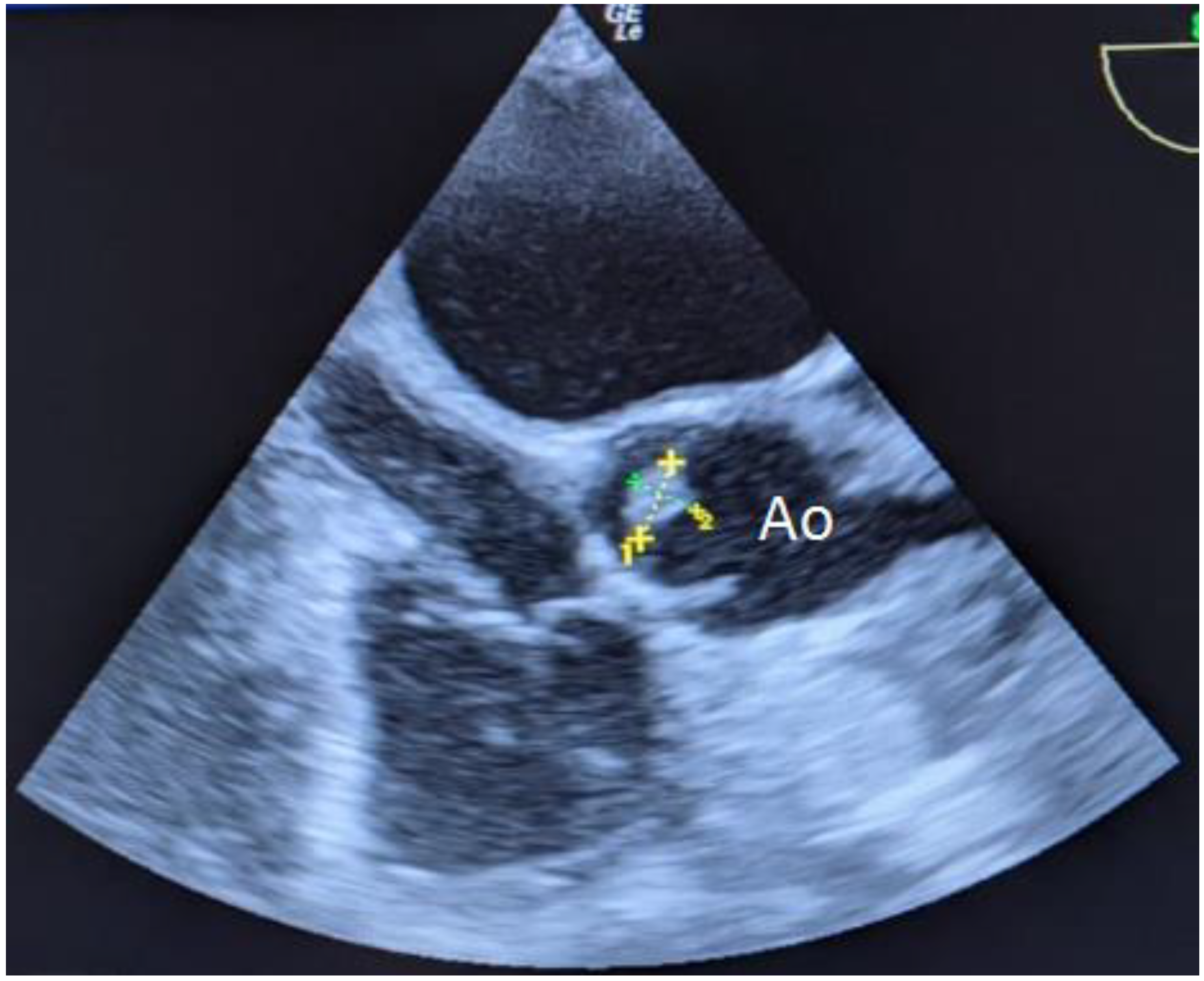 The TEE performed on the 3rd day revealed a hyperechogenic mobile structure of 10×9 mm in size located along the free edge of the noncoronary leaflet of the aortic valve (