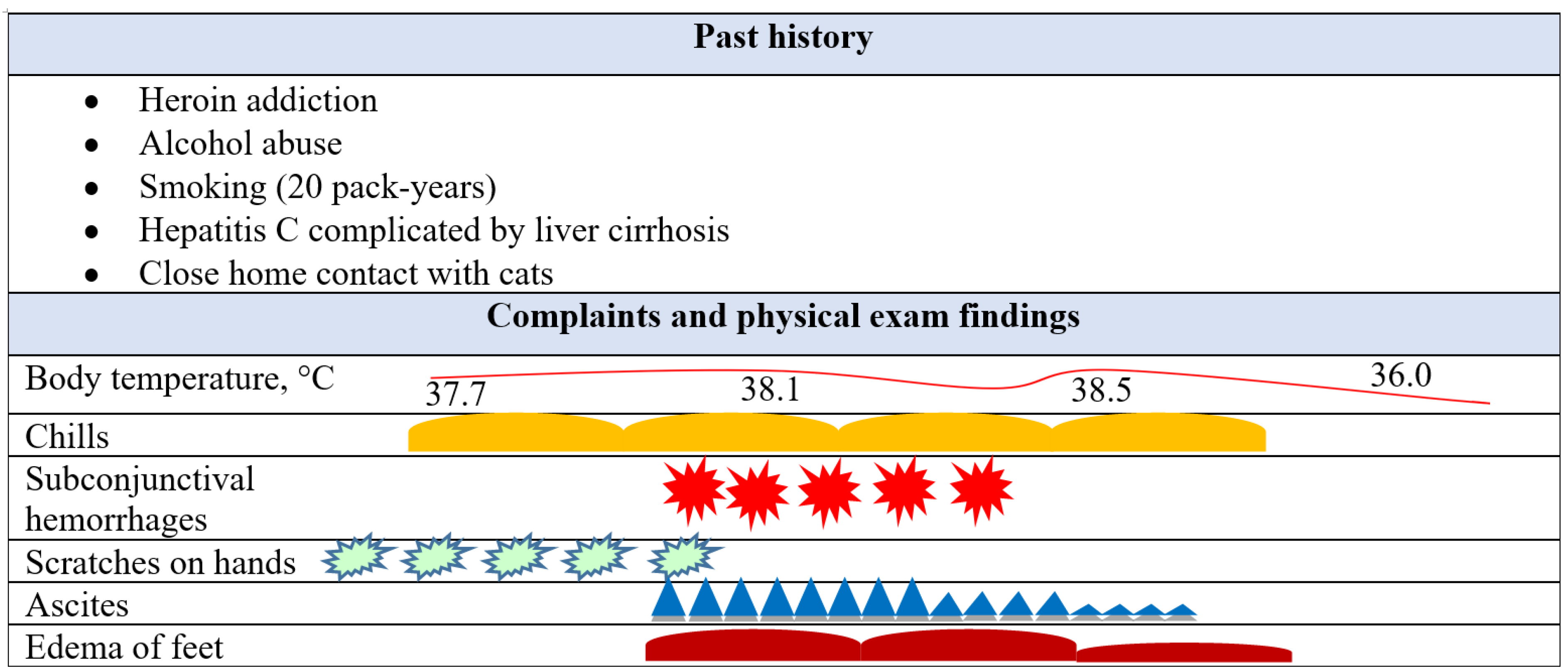 On admission, her condition was considered moderately severe, her axillar body temperature was 38.1 °C, blood pressure—100/60 mmHg, pulse rate—110 beats/min, respiratory rate—21/min, on-air oxygen saturation—96%. Multiple telangiectasias were revealed on the face and the chest. Petechial hemorrhages were seen on the conjunctiva of the lower eyelid, subcutaneous hematomas—on the right thigh, elbows of both arms, forearms. There were traces of scratches seen on the skin of the hands, and bilateral edema of the feet. Percussion and auscultation of lungs was unremarkable, heart sounds were muffled, no murmurs revealed. The abdomen was moderately enlarged due to ascites, soft, moderately painful in the right hypochondrium. Percussion size of the liver was 13×11×9 cm, the edge was painful on palpation, the spleen was enlarged (20×10 cm). A neurological examination revealed no significant pathological changes with the exception of the signs corresponding to a mild hepatic encephalopathy.