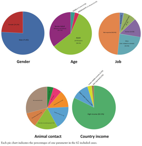 The data of the included studies are shown in Table 1. Of 62 cases, 47 patients (75.8%) were male and 15 patients (24.2%) were female. Their average age was 54.16 years, and the majority of cases were adults (19-59 years) (58.1%). The job of 30 patients (48.4%) was not clearly determined, the other 32 patients mainly had jobs that involved direct contact with animals as follows: nine (14.5%) were farmers, six (9.7%) had a fish/seafood-related job, two (3.2%) were butchers and 15 (16.1%) had jobs but with no clear relation to animals (Figure 2).