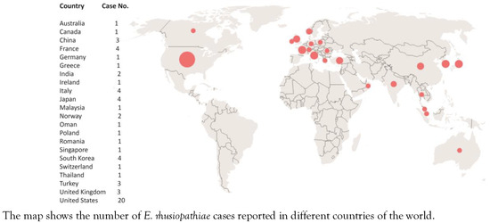 Although E. rhusiopathiae infection in humans is not a common infection, it can occur as a sporadic disease and, as our results indicated, the number of cases have increased in recent years. Sporadic infection with this bacterium needs to be accurately diagnosed at early stages otherwise severe complications including heart failure may occur. Our results showed that most human cases of E. rhusiopathiae infection have been reported from developed and high-income countries, probably due to the better laboratory settings for the diagnosis of this infection. This may explain the underestimated cases of human infections caused by E. rhusiopathiae in developing and undeveloped countries.