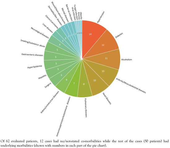 Regarding the underlying morbidity of the patients, 12 cases had no/not-stated underlying morbidities while the rest of the cases (50 patients) had underlying conditions associated with E. rhusiopathiae infections (Figure 4). These underlying morbidities included hypertension (14 cases), diabetes (12 cases), alcoholism (11 cases), arthritis/musculoskeletal diseases (10 cases), heart diseases (10 cases), pulmonary diseases (eight cases), immunosuppression/autoimmune diseases (seven cases), kidney/urinary tract diseases (six cases), surgery (five cases), hepatitis (five cases), hyperlipidemia (five cases), gastroenteric diseases (five cases), smoking/substance abuse (five cases), neurological diseases (four cases), liver diseases (three cases), cancer/carcinoma (three cases), dermatitis/skin diseases (two cases), wound/laceration/trauma (two cases), mental diseases (two cases), bacterial infection (two cases), viral infection (one case), fungal infection (one case), anemia (one case), and obesity (one case) (Figure 4).