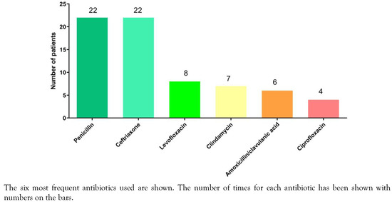 Antibiotics were used to treat E. rhusiopathiae infections in 57 patients while for five patients antibiotics were either not used or not reported (Table 1). The most frequently used antibiotics were penicillin and ceftriaxone (each in 22 patients) followed by levofloxacin (eight patients), clindamycin (seven patients), amoxicillin/clavulanic acid (six patients), ciprofloxacin (four patients), imipenem/cilastatin (two patients), gentamicin (two patients), ampicillin/sulbactam (two patients), piperacillin/tazobactam (two patients), and cephalosporin, rifampicin, vancomycin, moxifloxacin, doxycycline, ofloxacin, teicoplanin, oxacillin, daptomycin, ceftazidime, cefazolin, and meropenem each for one patient (Table S2). The most frequently used antibiotics are shown in Figure 6.