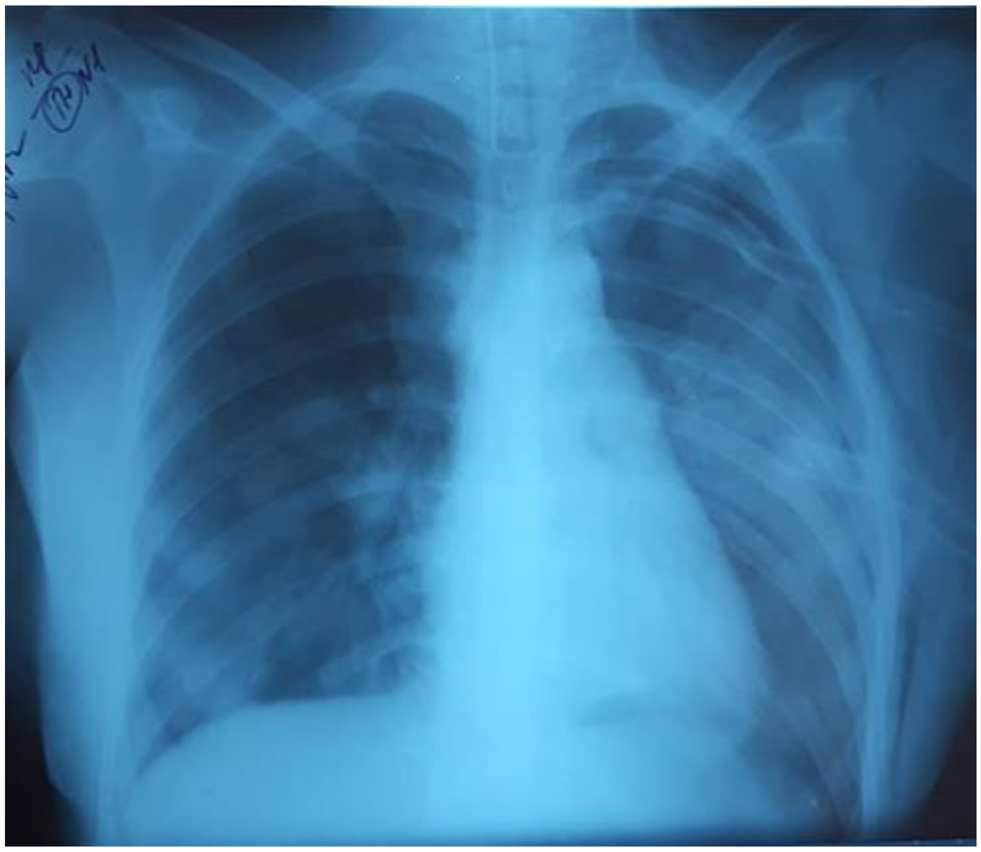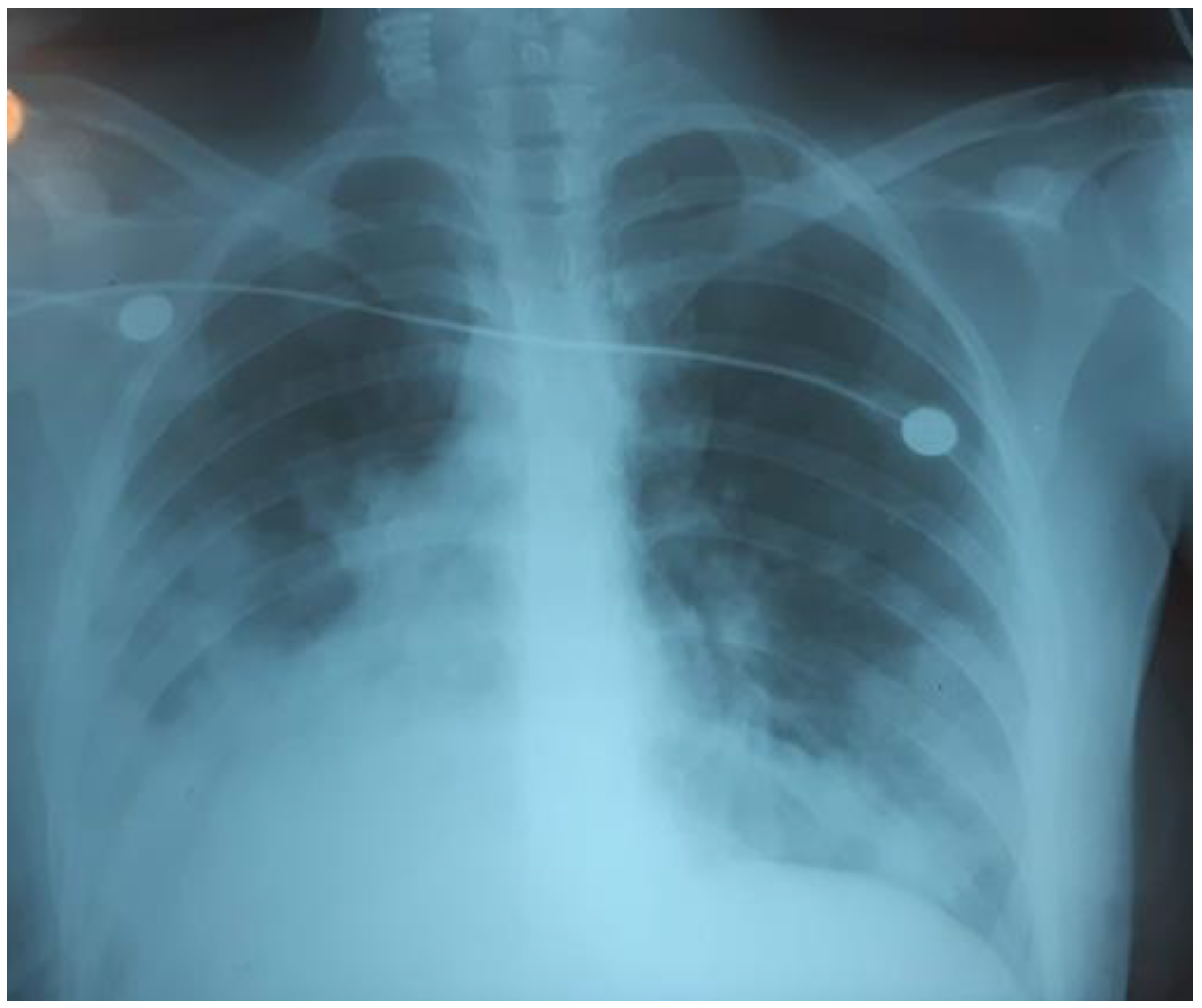 Figure 3). The lung ultrasound showed signs of interstitial syndrome on both sides, alveolar consolidation on the left, left-sided hydrothorax.