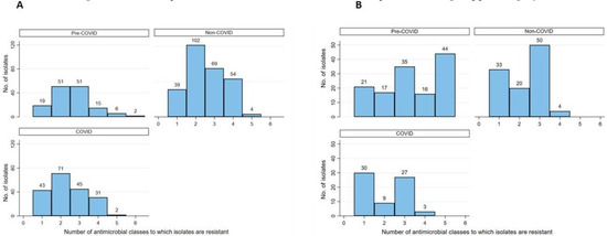 Pseudomonas aeruginosa isolates. The AMR data represented isolates from five specimen types (body fluids; blood; respiratory; wound, bone, or other tissues; and urine) of patients admitted to four wards (surgical, medical, pediatric, and maternal-postnatal). Tested isolates between January 2019 and February 2020 represented the pre-COVID-19 pandemic period in Kuwait, whereas those from February 2020 until April 2021 represented the ‘during COVID-19’ period.