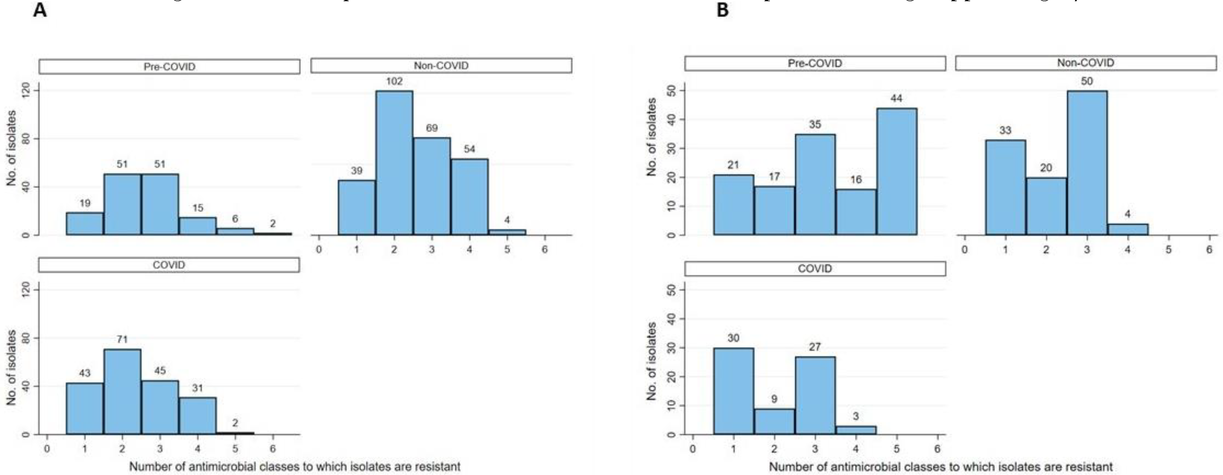 - Bongiovanni, M.; Barilaro, G.; Zanini, U.; Giuliani, G. Impact of the COVID-19 pandemic on multidrug-resistant hospital-acquired bacterial infections. J Hosp Infect. 2022, 123, 191–192. [Google Scholar] [CrossRef] [PubMed]