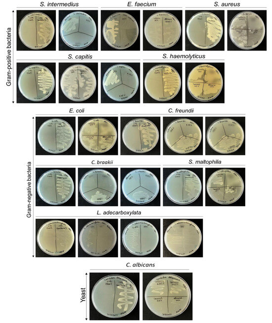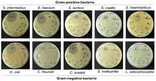 The results revealed that S. intermedius, E. faecium, S. haemolyticus, E. coli, C. braakii, S. maltophilia, and L. adecarboxylata were sensitive to levofloxacin, while S. aureus, S. capitis, and C. freundii showed an intermediate susceptibility. None of the isolates was resistant to levofloxacin. In addition, E. coli and L. adecarboxylata were sensitive to amoxicillin, and all of the other isolates were resistant. Furthermore, E. faecium, S. capitis, E. coli, S. maltophilia and L. adecarboxylata were sensitive to tetracycline, S. intermedius, S. haemolyticus and C. braakii showed an intermediate susceptibility, and S. aureus and C. freundii were resistant. On the other hand, E. faecium, S. aureus, S. capitis, S. haemolyticus, E. coli, C. freundii, C. braakii, S. intermedius, and L. adecarboxylata were sensitive to doxycycline and S. intermedius showed an intermediate susceptibility. None of the isolates was resistant to doxycycline. The diameters of the inhibition zones are shown in Table 1 and Figure 1.