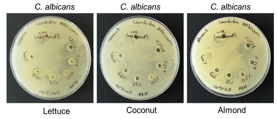 Susceptibility of C. albicans to lettuce, coconut and almond oils at different concentrations (50%, 25%, 6.25%, 3.125%). Methanol (5%) is a negative control.