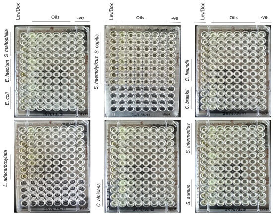 From the antibiotic-resistance profiles, antibiotics with a broad-spectrum activity are used in this study. Levofloxacin, a member of the quinolone family, acts by inhibiting bacterial topoisomerase IV and DNA gyrase enzymes, thus inhibiting DNA replication, transcription, and repair [17]. Amoxicillin belongs to the beta-lactam family and acts by inhibiting transpeptidation, thus destroying the cell wall of bacteria [18]. In addition, tetracycline and doxycycline, members of the tetracyclines family, act by inhibiting the 30S ribosomal subunit and inhibiting protein synthesis, respectively, thus leading to the inability of bacterial cells to function [19]. Among the tested antibiotics, doxycycline had the broadest activity spectrum because all tested bacterial isolates were susceptible to it. This result is similar to a previous study that tested the susceptibility of bacteria to doxycycline [19]. Many previous studies revealed the high antibacterial activity of the mentioned antibiotics against the tested bacterial isolates, except amoxicillin which has shown decreased activity against many bacteria [1]. The resistance raises a public health problem and, in turn, the need for novel antimicrobial agents with a unique mode of action. In this regard, plant-derived EOs have been used as effective antimicrobial agents [11,20]. Many EOs tested previously showed inhibitory effects against bacteria and yeast. Most importantly, EOs are environmentally safe and non-toxic [5]. This study revealed that the EOs exhibited antibacterial and antifungal activities. Almond oil possessed bactericidal effect due to the presence of aminoglycosides, which are used in many countries to treat microbial pathogens. Lettuce and coconut oils’ activity was assessed by the presence of flavones, saponins, and sterols [21]. Upon agar well diffusion, lettuce and coconut oils displayed a better antibacterial activity on Gram-negative bacteria. This result is consistent with previous studies that showed that Gram-positive bacteria are more resistant to EOs because of their thick peptidoglycan layer [5]. On the other hand, almond oil exhibited better antibacterial activity on Gram-positive bacteria. Such resistance could be due to the lipopolysaccharides of the cell wall of Gram-negative bacteria [5]. Regarding bacterial susceptibility, L. adecarboxylata and S. aureus were the most sensitive. On the other hand, S. haemolyticus and E. coli were the most resistant. This is due to the composition of the bacterial cell wall, in which many previous studies reported that the efficiency of EOs differs based on the type of bacterial isolate [20]. C. albicans showed susceptibility to the three EOs. The best susceptibility was noticed for almond oil. In contrast, susceptibility to lettuce and coconut oils was detected at higher concentrations. These susceptibility differences are due to the chemical composition of oils, as well as the eukaryotic characteristics of C. albicans [11].