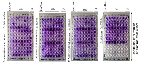 Inhibition of the biofilms’ formation after 24hrs of incubation with the three EOs. (-ve: negative control)