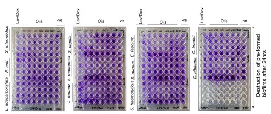Destruction of pre-formed biofilms after 24hrs of incubation with the EOs. (-ve: negative control)
