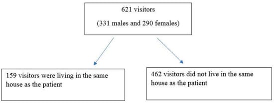 A total of 621 visitors (331 males and 290 females) were included in the study (Figure 1). The number of visitors living in the same house as the patient they visited was 156 (25.1%). The median number of visits was 1 (IQR:1-3). While 544 visitors did not have any infectious symptoms, 77 (12.4%) had at least one infection-related symptom with 49 reporting a cough, 21 rhinorrhea, 12 fever, 7 diarrhea, and 1 vomiting but none of the visitors had shingles. A total of 426 (68.6%) visitors stated that they would cancel their visit if they had any infection-related symptoms while 195 (31.4%) said that they would not cancel for this reason.