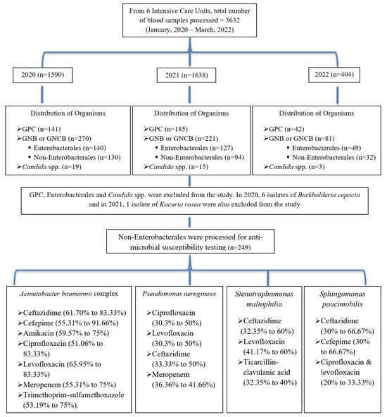 The Gram-positive cocci, Enterobacterales and Candida spp. have always been the predominant organisms causing BSI but in the current study, only non-Enterobacterales (Acinetobacter baumannii complex, Pseudomonas aeruginosa, Stenotrophomonas maltophilia and Sphingomonas paucimobilis) were included.