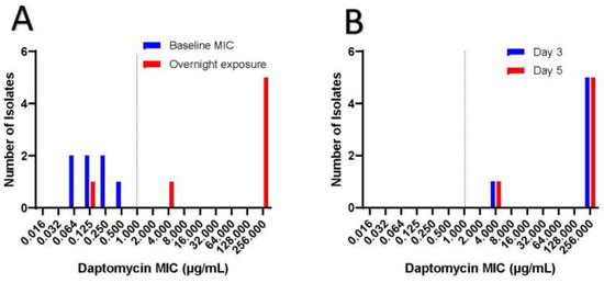 Figure 2 shows the MIC to dalbavancin for the seven clinical isolates in which all showed susceptibility to dalbavancin with MIC less or equal to 0.032 µg/mL. Interestingly, all clinical isolates were susceptible to daptomycin at baseline (Figure 3). However, after overnight exposure to daptomycin, six (85.7%) isolates showed MIC over 1 and five (71.4%) had MIC over 256. This daptomycin resistance persisted despite growing each isolate daily on blood agar plates and then testing for daptomycin non-susceptibility on days 3 and 5 (Figure 3). All isolates retained vancomycin susceptibility on day 1, 3 and 5.