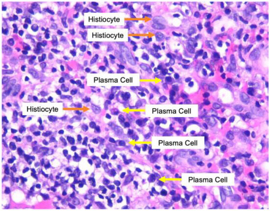 Infiltration of dense band-like inflammatory cells consisting of plasma cells, histiocytes, lymphocytes, epithelioid cells, and neutrophils (hematoxylin-eosin staining).