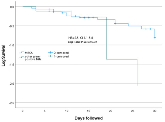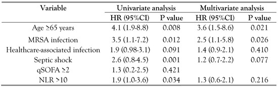p = 0.024) and MRSA infection (HR: 3.6; 95%CI: 1.5–8.5;