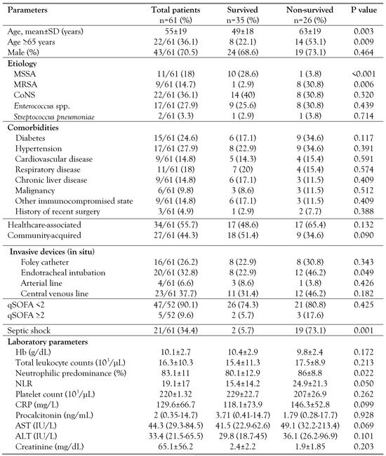 Enterococcus isolates, the proportion of vancomycin-resistant enterococci (VRE) and linezolid-resistant enterococci (LRE) were 11.8% and 5.9%. The overall mortality in Gram-positive BSIs was 42.6%. Older age, MRSA infection, septic shock, and high NLR were significantly associated with mortality. On the Cox regression model, age ≥ 65 years (HR: 2.5; 95%CI: 1.1–5.8;