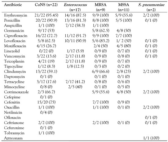 Enterococcus spp. (27.9%), methicillin-susceptible