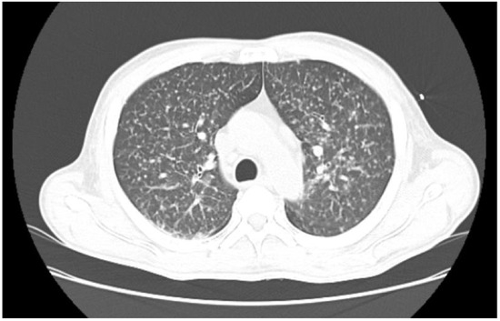 Axial thorax CT-scan: Miliary tuberculosis pattern of the lungs.
