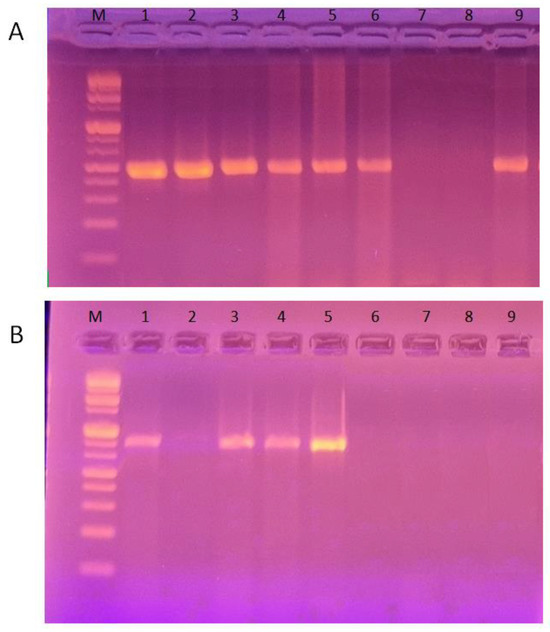 Detection of class 1 and 2 resistance integrons among P. aeruginosa isolates by PCR. (A) PCR amplification of intI1 gene yielding DNA fragments of 480 bp. (B) PCR amplification of intI2 gene to produce DNA fragments of 850 bp. Lane M shows the DNA molecular marker (1 kb DNA ladder).