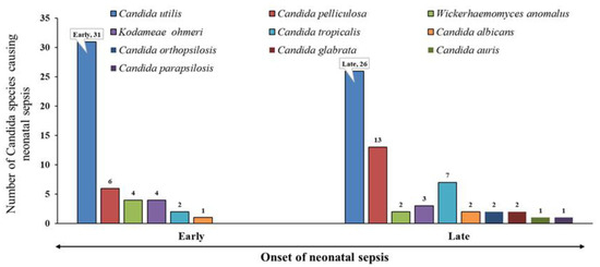 The spectrum of fungi causing neonatal candidemia varies from region to region. Previously, Candida albicans was the most common cause of neonatal candidemia. However, in the recent era, the emergence of non-albicans Candida has been reported around the globe. Among these, C. tropicalis, C. glabrata, C. parapsilosis and C. krusei account for nearly two-third of candidemia events. However, rare Candida species like C. auris, Wickerhamomyces anomalus, Kodamaea ohmeri, C. pelliculosa and C. orthopsilosis have been reported to cause neonatal sepsis [9,11]. This altered spectrum and upsurgence of newer/rare Candida species has been attributed to the availability of sophisticated diagnostic facilities like VITEK-2 and MALDI-TOF. In the present study, we noted the emergence of Candida utilis as the most common fungus causing neonatal sepsis. Moreover, other rarely reported fungi like C. pelliculosa, W. anomalus, Kodamaea ohmeri were also isolated. In the literature, Candida utilis causing sepsis has been reported around the globe [12,13]. C. utilis is an edible yeast, whose telemorphic stage, Cyberlindnera jadinii, is being used as yeast additive in the food industry [14]. Therefore, in each case of suspected neonatal candidemia, a blood culture should be done.