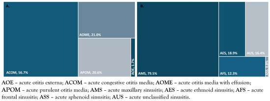 Frequency of types of acute otitis (A) and acute sinusitis (B) in study patients.