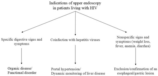 Many patients living with HIV will experience upper gastrointestinal symptoms at some point during the course of the disease but a lot of these symptoms are non-specific and multifactorial (pyrosis, dyspepsia, anorexia, weight loss). The most typical symptoms of esophagitis are odynophagia (retrosternal pain with swallowing) and/or dysphagia (difficulty with ingestion of food from the oropharynx through the esophagus). Indications for upper endoscopy in patients living with HIV are reviewed in Figure 1.