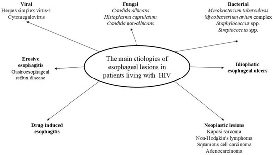 In patients living with HIV, esophageal lesions can result from a variety of infectious, neoplastic, and idiopathic conditions. The main etiologies of esophageal lesions include fungal, viral, bacterial, neoplastic or idiopathic causes (Figure 2) [3,4,5,6,7,8].