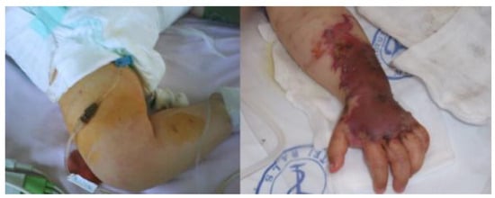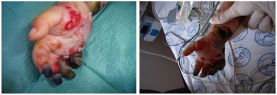 - Bhatti, U.F.; Williams, A.M.; Raghavendran, K.; Georgoff, P.E. Four-extremity amputation following disseminated intravascular coagulation and purpura fulminans. BMJ Case Rep. 2019, 12, e228028. [Google Scholar] [CrossRef]