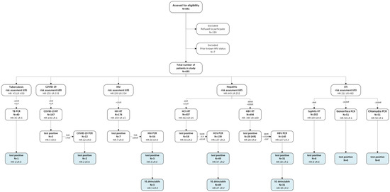 The questionnaire answers were used in a testing algorithm to classify people at high risk for the infectious diseases of interest (Appendix B). For HIV and viral hepatitis, high risk was defined by disclosing at least one high risk sexual activity, sexual violence, drug use, or blood contact related risk factor. The same sexual risk factors next to genital symptoms were applicable to consider people at high risk for STIs. Symptoms suggestive of acute or advanced HIV also indicated a high risk for HIV. Patients with symptoms according to the WHO COVID-19 definition [15] or self-tests suggestive of COVID-19 were considered high risk. The presence of respiratory or constitutional symptoms suggestive of tuberculosis indicated high risk. People without risk factors were classified as low risk. Regardless of risk classification, all patients were offered testing by rapid tests. Confirmatory standard of care testing was done in those with reactive rapid tests and offered to all classified as high risk regardless of rapid test outcome. Participants were allowed to opt out of testing for any of these infectious pathogens or request a PCR irrespective of the risk classification.