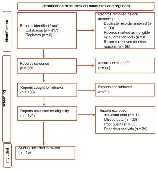 Among the 417 articles retrieved from the different databases, there were 201 duplicates that were deleted. Records were screened. A series of articles were removed and the rest of the articles were evaluated for retrieval. At this stage again, with the exclusion of several articles, the eligibility of other studies was checked, and finally, due to the reasons mentioned in Figure 1, only 15 articles were eligible to be included in this review. Included studies used standard techniques for biofilm evaluation such as microtiter plate (MTP), Tissue culture plate (TCP), and Congo Red Agar (CRA). All the studies included here, used PCR for the detection of ica operon genes (Table 1).