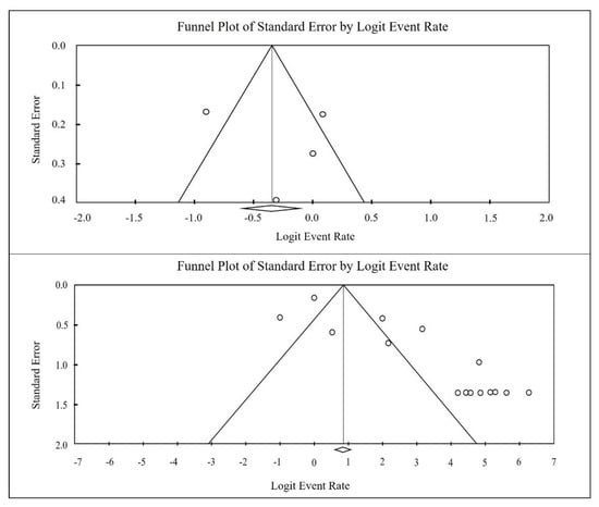 Funnel plot of meta-analysis on the ica gene prevalence (top image), and biofilm formation (below image) in S. aureus isolated from clinical samples.