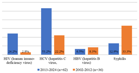 The most frequently identified were positive cases for hepatitis C virus (HCV) – 41.8%, syphilis – 20.4%, human immunodeficiency virus (HIV) – 16.3% and hepatitis B virus (HBV) – 7.1%.