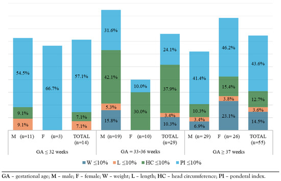 The reporting of growth parameters at gestational age according to intrauterine growth curves, identified cases situated on percentiles ≤10% indicating unsatisfactory growth, low for age. The most frequently affected early in fetal development was the ponderal index at less than 32 weeks of gestation and the head circumference at the age between 33 and 36 weeks of gestation (Figure 3).