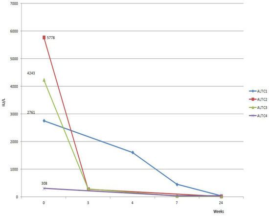 ALT dynamics in the four reported cases. ALT C1 – alanineaminotransferase values for case 1; ALT C2—alanine aminotransferase values for case 2; ALT C3—alanine aminotransferase values for case 3; ALT C4—alanine aminotransferase values for case 4.