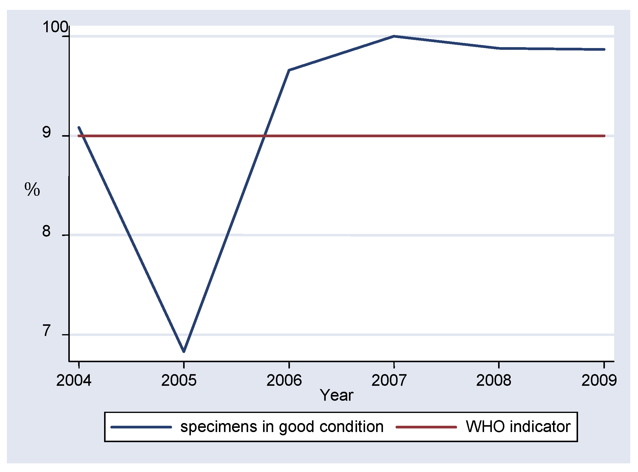 During 2004-2009, an average of 92.20% of specimens reached the laboratory in good condition in the period under review and met the WHO target [