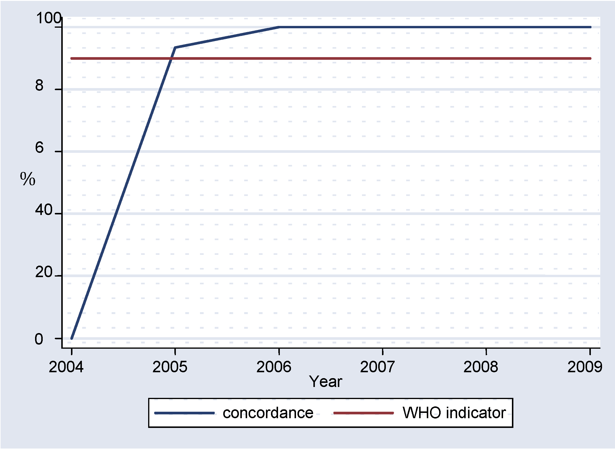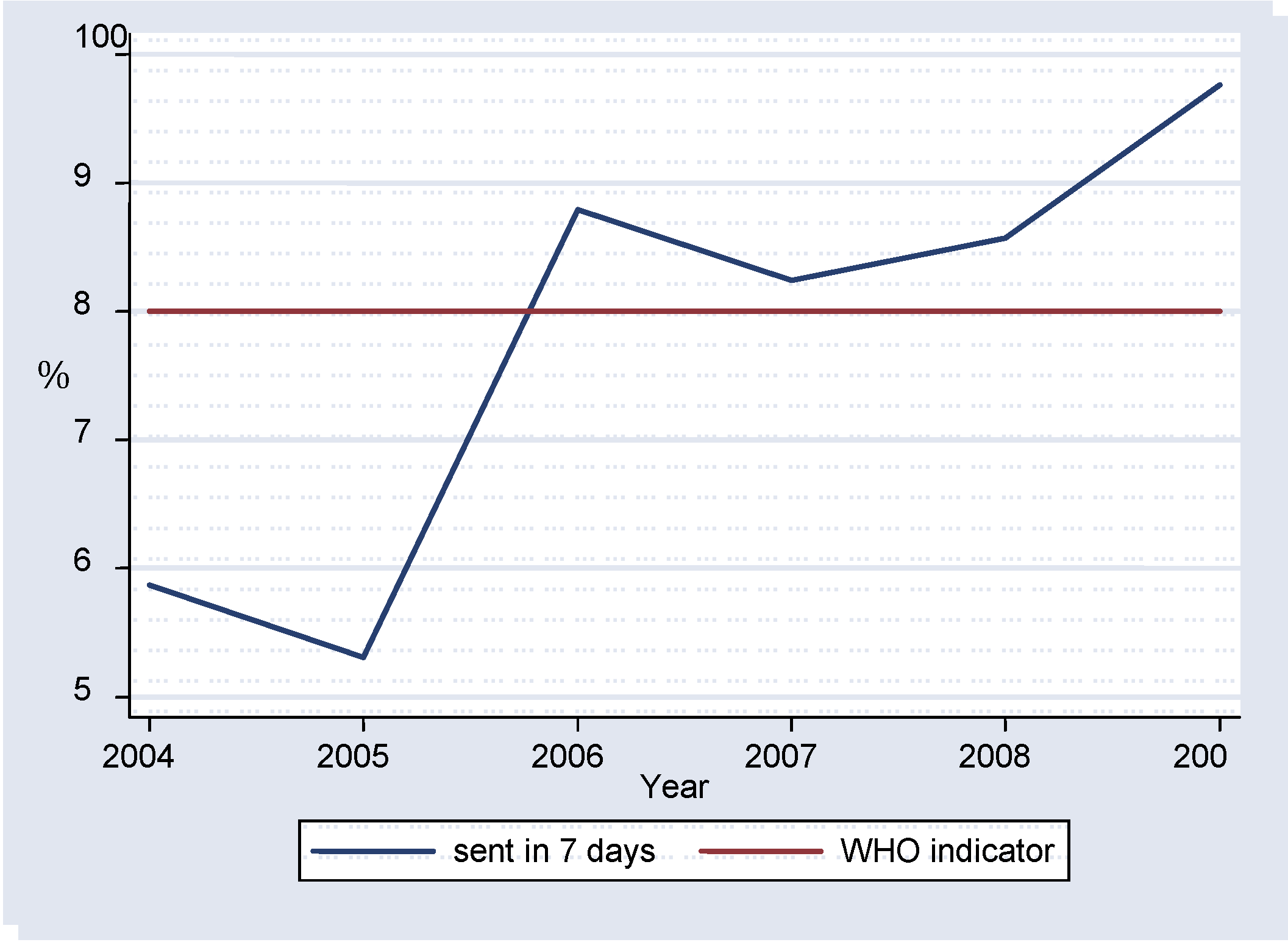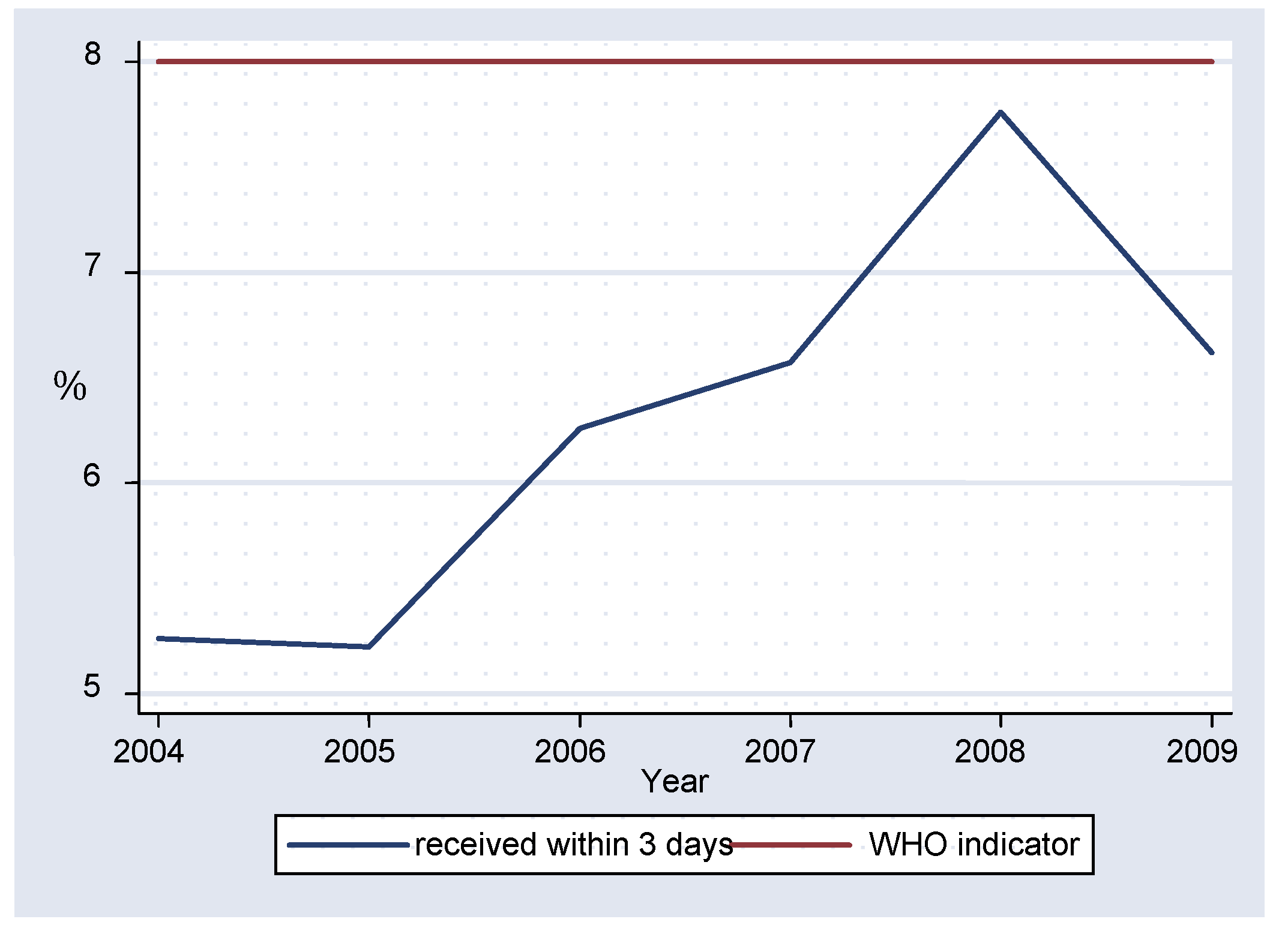 Between 2004-2009 an average of 62.81% of specimens reached the laboratory in the recommended three days, with a statistically significant difference between 2004 and 2005 (p=0.0114) and between 2004 and 2007 (p=0.0094). The proportion of specimens reaching the laboratory within three days fluctuated from 52.60% in 2004 to a peak of 77.60% in 2008 but all values were below the WHO target of 80% (