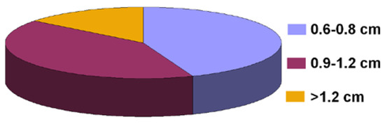 p = 0.0009. Comparing the two groups based on calculus size, for stones with diameters of 0.6–0.8 cm 38.71% of patients were febrile in Group 1, compared with 10.88% in Group 2 (