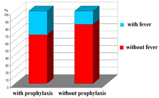 Results: We recorded fever in a total of 108 cases, accounting for 22.83% of all subjects in the study. Group 1 included patients who received antibiotic prophylaxis; 48 of 147 (32.65%) were febrile, compared with Group 2 (no antibiotic prophylaxis), where we recorded febrile syndrome in 60 (18.40%) cases,