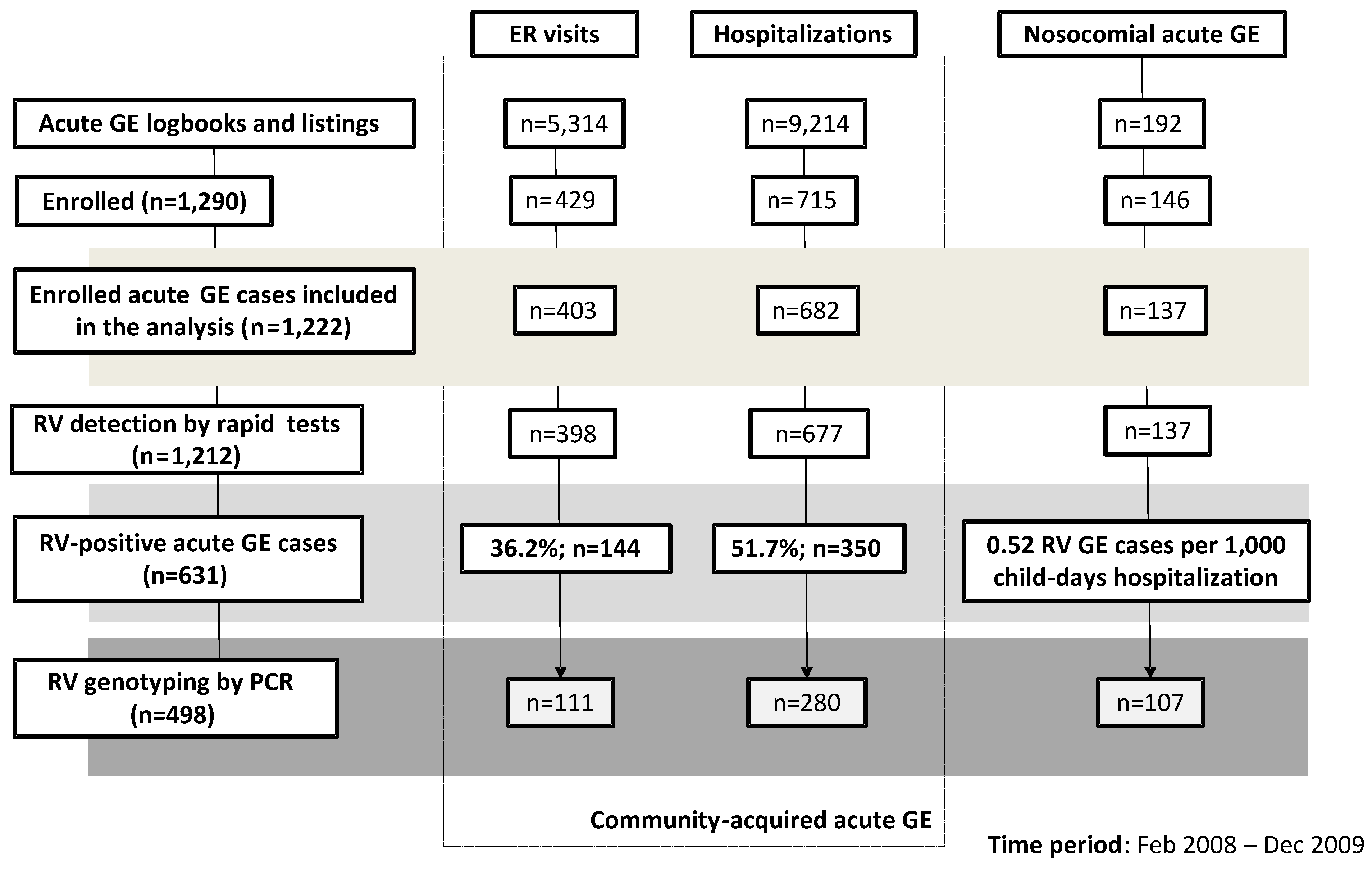 - Forster, J.; Guarino, A.; Parez, N.; et al. Hospital-based surveillance to estimate the burden of rotavirus gastroenteritis among European children younger than 5 years of age. Pediatrics. 2009, 123, e393–e400. [Google Scholar] [CrossRef]
