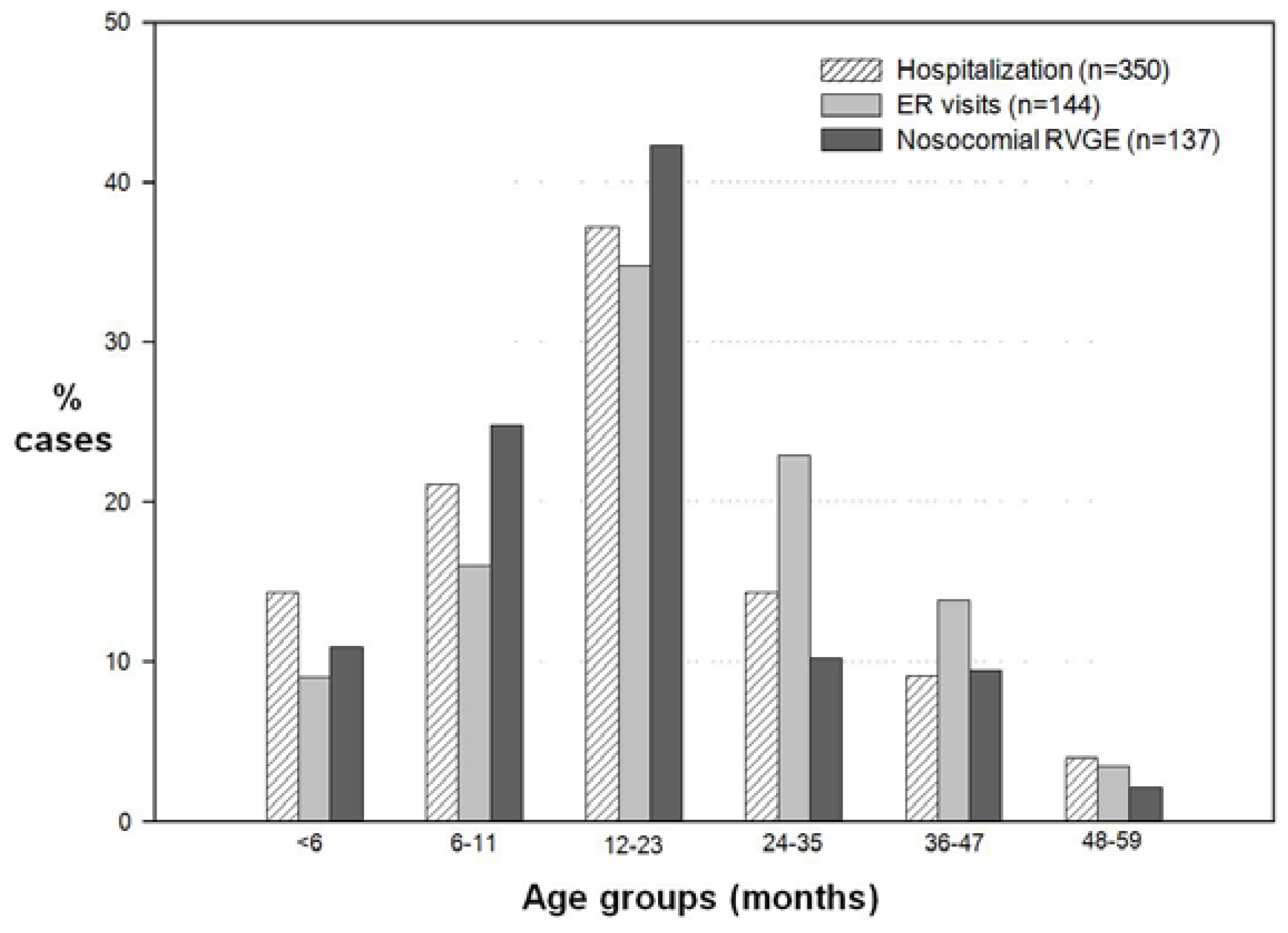 - Giaquinto, C.; van Damme, P. REVEAL Study Group. Age distribution of pediatric rotavirus gastroenteritis cases in Europe: The REVEAL study. Scand J Infect Dis. 2010, 42, 142–147. [Google Scholar] [CrossRef] [PubMed]