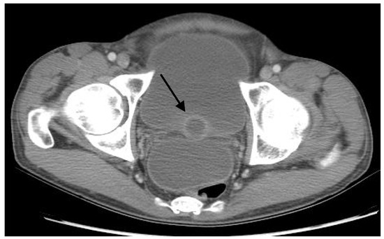 Computed tomography (CT) of the abdomen and pelvis with intravenous and oral contrast demonstrating prostatic abscess (arrow).