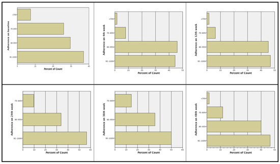 At screening, 69.2% of the subjects had been more than 80% adherent to prior treatment, i.e., subjects stated they had forgotten to take the medication one to maximum six days from the total 30 days of the month. The majority of the subjects were more than 80% adherent to treatment: baseline (66.2%), Week 4 (89.8%), Week 12 (91.8%), Week 24 (89.8%), Week 36 (84.7%), and Week 48 (86.4%). At Week 24 and Week 48, more subjects had an adherence rate >80% compared to baseline, i.e., 89.8% and 86.4% of the subjects at Week 24 and Week48, respectively, compared to 66.2% of the subjects at baseline (see Figure 1).
