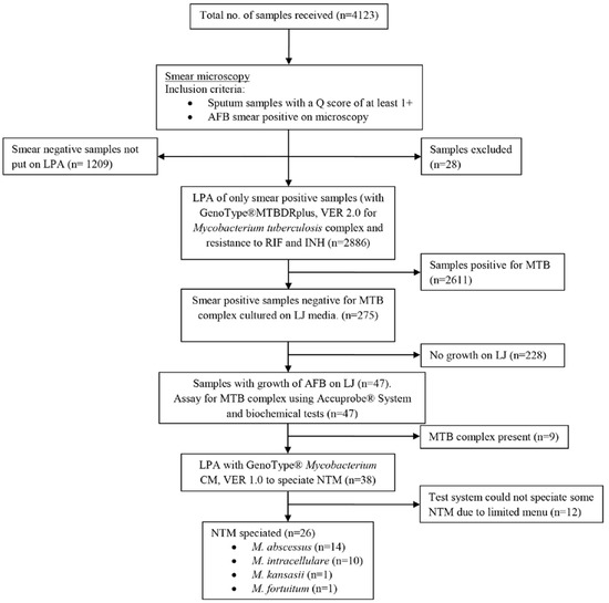 - Maurya, A.K.; Nag, V.L.; Kant, S.; et al. Prevalence of non-tuberculous mycobacteria among extrapulmonary tuberculosis cases in tertiary care centers in Northern India. Biomed Res Int 2015, 2015, 465403. [Google Scholar] [CrossRef]