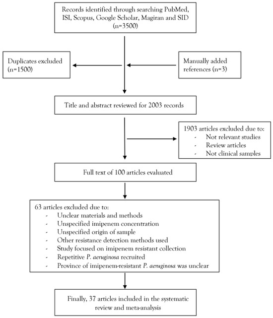 We excluded articles if: (I) samples were partially or totally taken from different provinces, and we were not able to attribute the results to distinct provinces; (II) samples were partially or totally collected from imipenem-resistant isolates; (III) the origin of the sample was unclear in terms of clinical or environmental samples, we also excluded studies in which repetitive P. aeruginosa isolates had been used; (IV) finally, studies with unclear materials and methods were excluded, specifically regarding the concentration of imipenem in the applied disks, the producer company of the disk, and methods other than disk diffusion.