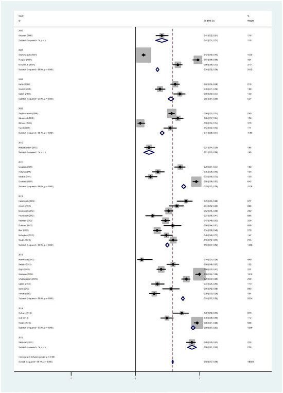 - Higgins, J.P.; Thompson, S.G. Quantifying heterogeneity in a meta-analysis. Stat Med 2002, 21, 1539–1558. [Google Scholar] [CrossRef] [PubMed]