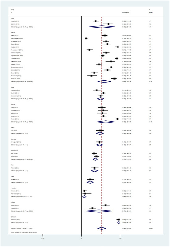 Active surveillance of trends in antibiotic resistance, due to high use and misuse of antibiotics, is necessary for the appropriate selection of antibiotics [10,50,51]. In the past few decades, an alarming increase in the prevalence of multidrug resistant P. aeruginosa isolated from clinical samples has been shown worldwide, including Iran [13,14,15,16,17,18,19,20,21,22,23,24,25,26,27,28,29,30,31,32,33,34,35,36,37,38,39,40,41,42,43,44,45,46,47,48,49,51]. During the past decade, multiple investigations have been conducted by Iranian researchers to determine the antibiotic resistance profile of P. aeruginosa using phenotypic and genotypic methods, in different regions, showing the importance of P. aeruginosa in the clinic [13,14,15,16,17,18,19,20,21,22,23,24,25,26,27,28,29,30,31,32,33,34,35,36,37,38,39,40,41,42,43,44,45,46,47,48,49]. Based on these studies, we conducted the present systematic review and meta-analysis to estimate the cumulative prevalence of IRPA using data collected from studies performed in different hospitals in Iran. A total of 37 publications were found. According to our meta-analysis, the prevalence of IRPA was 54% and was higher than fifty percent in many Iranian cities (Table 1). In a provincial perspective, Isfahan showed the highest prevalence of IRPA, with 65%, followed by Tehran with 61%, according to our meta-analysis. Our findings also revealed that the lowest percentage of resistance was reported from the Hamedan province (8%). The study by Suwantarat et al. reported carbapenem-resistant P. aeruginosa rates for southeast Asia countries and showed a lower percentage of resistance in those countries compared to Iran, including Philippines 31.1%, Singapore 23.3%, and Thailand 28.7% [52]. In addition, the findings of Hong et al. demonstrated that the percentage of imipenem-resistant P. aeruginosa in Japan and Korea is lower than our findings, with 28.5% and 22% of isolates being resistant, respectively [53]. However, findings similar to the results of this study were reported from Pakistan, in a study done by Ameen et al., which showed that out of 230 investigated strains of P. aeruginosa, 49.5% were imipenem-resistant [54].
